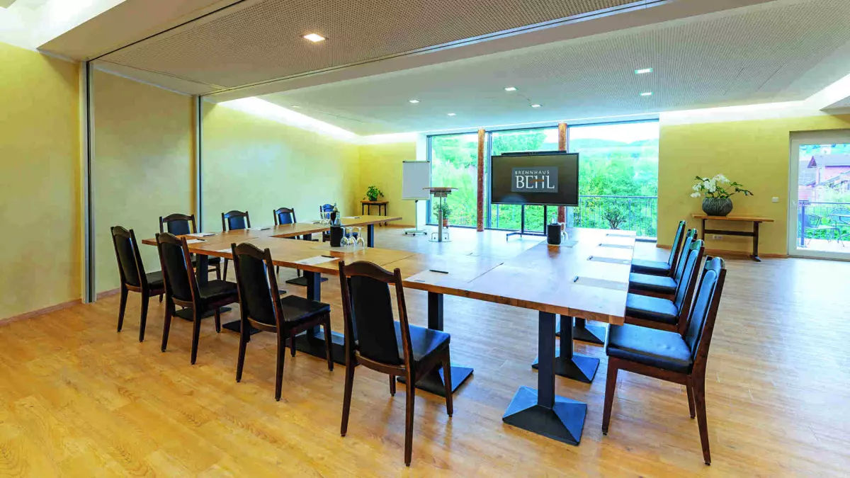 Schön, dass es so etwas noch gibt: Im Behl’s Genusshotel am Rande des Spessarts vereint die Familie Behl eine exzellente Fine-Dining-Küche, ausgesuchte Weine aus Deutschland und der Welt und ein familiäres, sehr persönliches Miteinander zu einer Wohlfühl-Atmosphäre, in der Gäste gerne arbeiten, genießen und das Leben feiern. Auf dem Frühstücksbuffet findet sich selbstgeräucherter Lachs, das Joghurt wird aus eigenen Kulturen gezogen, die Forelle stammt aus der Fischzucht in der Nähe und der Ziegenkäse aus dem nahen Bio-Berghof – die vielfach ausgezeichnete Küche setzt einen klaren Schwerpunkt auf Nachhaltigkeit und Regionalität, ohne dabei innovative Einflüsse aus der ganzen Welt außer Acht zu lassen. Die Leidenschaft fürs Kochen teilt Florian Behl – nach einigen Jahren in der Sterneküche – mit seinem Vater Gerhard, seine Frau Melanie und die Mutter Beate kümmern sich mit der gleichen Hingabe um alle anderen Belange ihrer Gäste. Professionell gestaltet die Familie auch das Angebot für Tagungsgäste: Vier unterschiedlich große Tagungsräume laden zu Meetings und Konferenzen, zu Workshops, Seminaren und Firmen-Events ein. In der klimatisierten „Sonne“ mit 140 m2 sorgen warme Farben, viel Licht und ein wunderbarer Blick in das Kahl-Tal für Energie und Konzentration. Mehrere Leinwände machen den Raum multifunktional, er ist teilbar und mit einem interaktiven Smart-TV mit Kamera- und Soundanlage ausgestattet. Direkt nebenan finden die Seminargäste Entspannung auf der großzügigen Terrasse. Im Raum „Zöllnerstube“ lassen sich in kleinerer Runde bis acht Personen Ziele vereinbaren, Round-Table- Gespräche führen oder Gruppenarbeiten durchführen. Eine ganz besondere Atmosphäre erleben die Gäste in der klimatisierten „Destille“ – Teile der historischen Bruchsteinwand sind mit modernen Designelementen kombiniert, modernste Soundund Lichttechnik und ein angrenzender begrünter Innenhof bieten den passenden Rahmen für Premium-Tagungen oder tolle Firmen-Events. Das abendliche „Brenn-Menü“ mit mehreren Gängen und köstlichen Destillaten ist der Renner unter den Tagungsgästen. Und so können die Gäste auch in geschmackvoll gestalteten Zimmern mit Namen wie „Morellenfeuerkirsche“ oder „Feldzwetschge“ am Abend zur Ruhe kommen.
