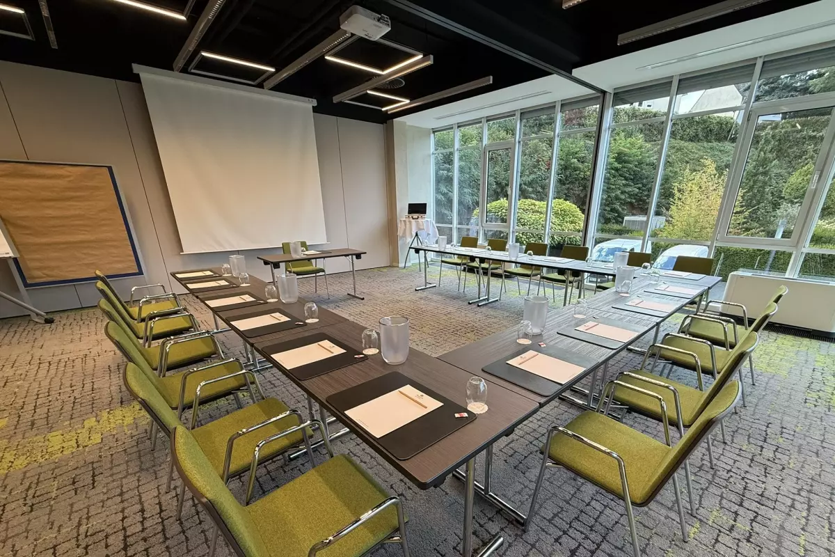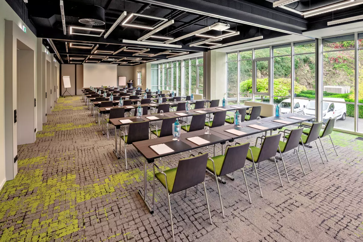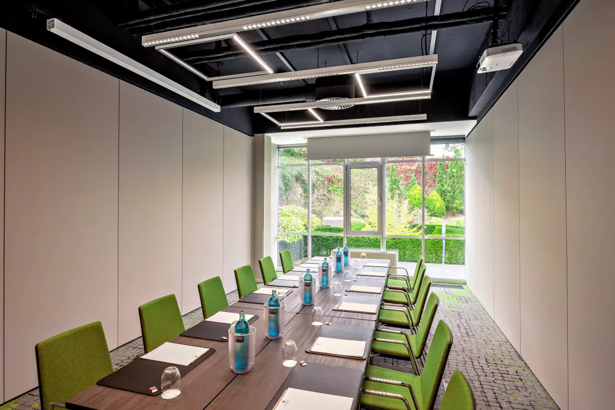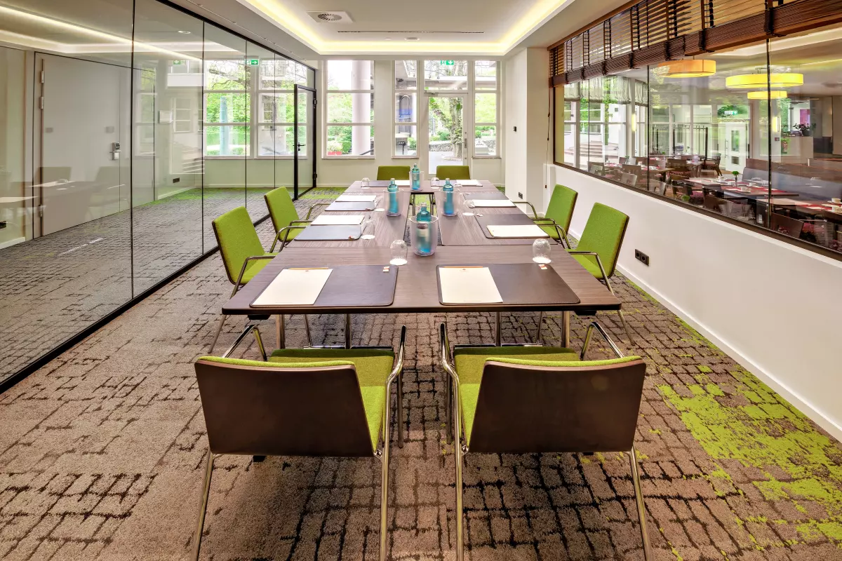 im Erdgeschoss schafft eine harmonische Verbindung zwischen Innenraum und Natur. Großzügige Fensterfronten geben den Blick frei auf den hoteleigenen Tagungs- und Eventgarten – eine grüne Kulisse, die Kreativität fördert und neue Perspektiven öffnet. Dank der flexiblen Trennwände ist eine individuelle Kombination der Räume möglich.