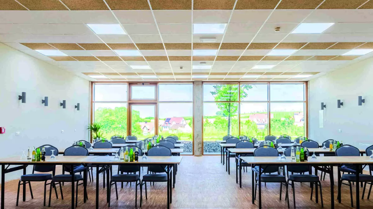 Es ist ein deutschlandweit einzigartiges Konzept, das dem Pfaffenhofener Stadtteil Eco-Quartier zugrunde liegt: Hier, vor den Toren der Stadt, werden Wohnen, Gewerbe und Landwirtschaft strikt nach Kriterien der Nachhaltigkeit ausgerichtet – ein zukunftsweisendes Umfeld, in dem vor drei Jahren das Hotel Alea Eco eröffnete. In dem modernen Haus sind Holz und Glas die dominierenden Bauelemente. Alle Zimmer sind aus massiver Fichte gebaut und sorgen somit für ein angenehmes Raumklima. Auch die Möbel bestehen aus Naturholz und bereits beim Bau wurde auf Kunststoffe fast völlig verzichtet. Dass die ökologische Ausrichtung modern und stylisch daherkommt, liegt an den trendigen Möbeln und Farben, mit denen das Hotel ausgestattet ist. Naturfarben, Kupfer und warme Materialien schaffen eine gemütliche Atmosphäre. Große Glasfronten lassen viel Licht hinein, der Blick auf grüne Wiesen und die gegenüberliegenden Hopfenfelder scheint zum Greifen nah. Das alles schafft beste Voraussetzungen für entspanntes Arbeiten. Sechs unterschiedlich große Tagungsräume stehen für Seminare, Workshops und Business-Events im Erdgeschoss zur Verfügung. Allen gemeinsam sind bodentiefe Fenster und die Möglichkeit, ins Freie zu treten oder im Grünen zu arbeiten. Herzstück der Tagungsebene ist das EcoPlenum mit 375 m², einer imposanten Raumhöhe von über acht Metern und einer breiten Fensterfront. 200 kupferfarbene Lichtkugeln illuminieren den befahrbaren Raum, der sich hervorragend für Tagungen, Kongresse, Präsentationen und Feste eignet. Flexibilität ist dem jungen, engagierten Team wichtig. Auf Wunsch können deshalb auch Get-together-Bereiche des Hotels in die Veranstaltungen mit einbezogen werden. Neben der ebenerdigen Terrasse, dem Bistro oder dem Campus bietet auch die 120 m² große Dachterrasse herrliche Möglichkeiten für abendliches Miteinander am Feuer, beim Barbecue oder beim Cocktailempfang – der phantastische Rundumblick in die Holledau immer inklusive. Die Region ist auch Lieferant für die Zutaten in der Küche. Teil des Konzepts ist es, dass das Frühstück sowie alle vegetarischen/veganen Gerichte im Hotel zubereitet werden, Fisch- und Fleischspeisen kommen von ausgewählten Caterern aus der Region.