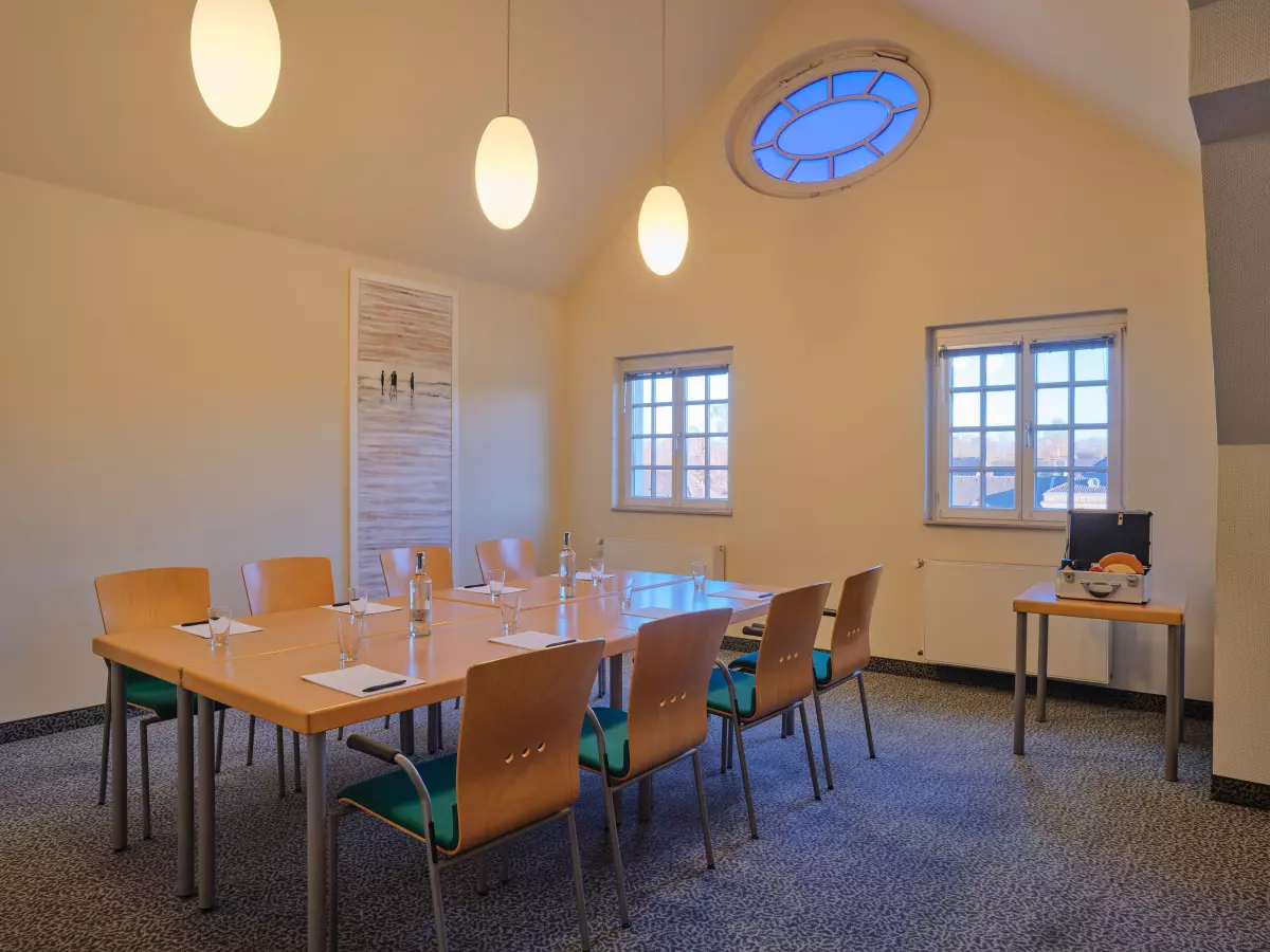 Der im Raum vorhandene massive Holztisch bietet Platz für bis zu 20 Personen.