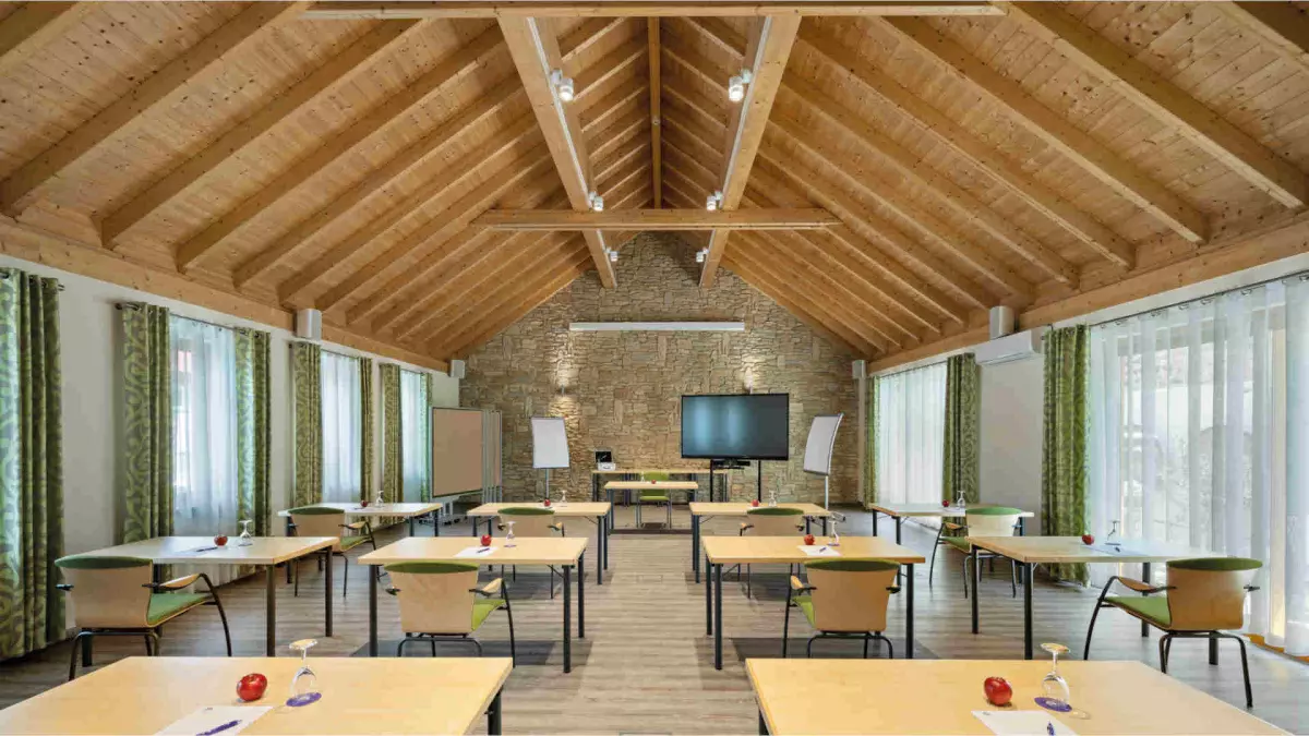 Wer in der Toskana tagen möchte, muss nicht über die Alpen fahren. Mediterranes Lebensgefühl gibt es auch in der Pfalz: Sanfte Hügel, Weinberge, so weit das Auge reicht, grüne Wälder und Lebensart pur prägen die malerische Region an der Deutschen Weinstraße. Die Hoteliersfamilie Charlier hat das toskanische Flair der Umgebung aufgegriffen und daraus eine charmante Wohlfühlatmosphäre in ihrem Traditionshotel geschaffen. Warme mediterrane Farben, gemütliche Stoffe, Holz und Naturstein prägen die Atmosphäre, lichtdurchflutete Räume lassen viel Sonne hinein und im Sommer lockt die Gartenterrasse mit gemütlichen Korbstühlen und Zitronenbäumchen. Ein Haus mit Seele, das es mit seinem südländischen Flair den Gästen leicht macht, den Alltag hinter sich zu lassen und sich auf neue Lerninhalte zu konzentrieren. Work-Pfalz-Balance nennen die Charliers das Lebensgefühl, eine Mischung aus ausgeglichenem genussfreudigem Leben und optimalen Arbeitsbedingungen. Dafür stehen 1.000 m² Veranstaltungsfläche zur Verfügung, verteilt auf 16 klimatisierte Räume auf verschiedenen Gebäudeebenen, ausgestattet mit innovativer Technik für klassische und hybride Tagungsformate. Stets sind die Tagungsgäste unter sich, haben direkten oder nahen Zugang zum mediterranen Garten, überall lockt der Blick in die schönen Weinberge. Entspannte Pausen finden im Foyer am großen Mühlsteintisch statt, die kreativen leckeren Snacks sind dabei ein Vorgeschmack auf das gute Essen, das im ausgezeichneten À-la-carte-Restaurant „Scharfes Eck“ serviert wird. Besonders beliebt ist das Tagungslandhaus mit seinen Natursteinwänden und dem offenen Holzgiebel. Hier können Gedanken fliegen und rauschende Feste gefeiert werden – immer entspannt, komplett entschleunigt. Nicht umsonst sieht man die Schnecke als Symbol für Ruhe und Gelassenheit überall im Hotel. Ein Muss für alle Seminargäste ist deshalb ein Besuch der eigenen Schneckenfarm ganz in der Nähe. Mit der Erkenntnis, dass man auch langsam, aber sicher an seine Ziele gelangt, können die Gäste am Abend die köstlichen Weine in der urigen „Weinbergschnecke“ genießen und sich entspannt auf den nächsten Tag einstimmen.