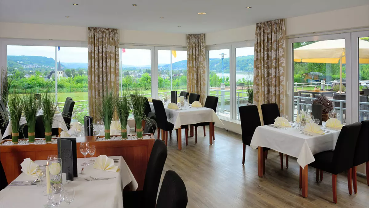 Der Ausblick auf die Rheinschleife bei Remagen ist einfach herrlich entspannend. Kein Wunder, dass der Tagungsraum „Wintergarten“ im obersten Stockwerk des Ringhotels Haus Oberwinter einer der beliebtesten ist. Von hier oben hat man nicht nur den mächtigen Strom samt Schifffahrt, sondern auch den gegenüberliegenden Ort Unkel sowie die weite Landschaft des Mittelrheins wunderbar im Blick. Ein eigener kleiner Thekenbereich sorgt für eine bequeme Pausensituation, sodass der Wintergarten gern von Gruppen gebucht wird, die sich etwas zurückziehen möchten. Aber auch die weiteren Tagungsareale des Hauses haben einiges zu bieten. Sie sind gut durchdacht konzipiert, großzügig gestaltet und auch sie erlauben ruhiges Arbeiten in einer zurückgezogenen Atmosphäre. In der ersten und zweiten Etage bilden jeweils zwei moderne, ergonomisch möblierte Räume eine Einheit mit eigenem Pausenfoyer und WC-Anlagen, so haben unterschiedliche Gruppen ihr eigenes Raum-Ensemble für sich allein. Sie sind zur Bergseite hin ausgerichtet, aus den bodentiefen Fenstern schaut man direkt in den Wald, was den Räumen eine angenehme Ruhe und im Sommer eine natürliche Kühle verleiht. Die Pausenfoyers sind mit allerlei Annehmlichkeiten wie Kaffeespezialitäten und Buffet sowie einem ovalen Tisch mit Stühlen ausgestattet, so dass hier sowohl spontane Gruppenarbeiten als auch gemütliche Abendrunden am gut gefüllten Kühlschrank stattfinden können. Drei weitere Gruppenräume stehen zur Verfügung. Die Gästezimmer sind im Ambiente ähnlich und unterscheiden sich in puncto Lage und Größe, die zur Rheinseite gelegenen haben in der Regel Balkon. 19 Zimmer sind rollstuhlgerecht, nahezu das gesamte Hotel ist barrierefrei. Das Ringhotel Haus Oberwinter wird gern von Tagungsgruppen ausgewählt, die als Team zusammenbleiben möchten oder sollen. Die Lage des Hotels ist gut erreichbar, andererseits an der Rhein-Anhöhe doch so abgeschieden, dass die Gruppen auch des Abends nicht auseinanderlaufen. Dazu trifft man sich im Restaurant oder bei gutem Wetter im großen Biergarten, natürlich mit herrlichem Ausblick, und genießt die regionale Küche des Hauses. Das beheizte Indoor-Schwimmbad, eine Sauna sowie ein Fitnessraum stehen für den körperlichen Ausgleich zur Verfügung.