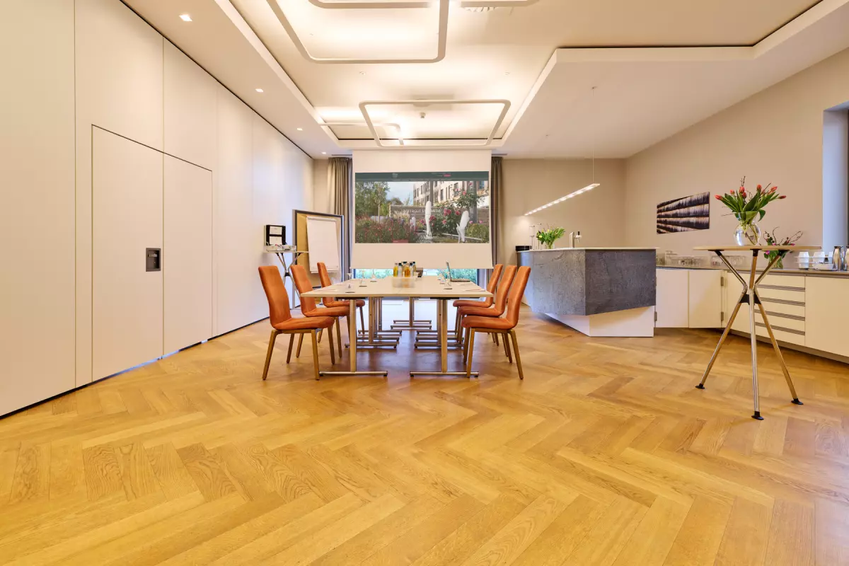 Willkommen im Gartenzimmer 1, unserem exklusiven Tagungsraum, der mit Echtholzparkett, viel Tageslicht und einer modernen Klimaanlage überzeugt. Hier schaffen Sie die perfekte Atmosphäre für produktive Meetings und kreative Workshops. Die harmonische Verbindung von natürlichem Licht und stilvollem Ambiente fördert nicht nur die Konzentration, sondern auch den Austausch von Ideen. Nutzen Sie unsere umfangreiche technische Ausstattung, um Ihre Präsentationen perfekt in Szene zu setzen. Lassen Sie sich inspirieren und gestalten Sie Ihre Veranstaltung in einem Raum, der Professionalität und Komfort vereint!