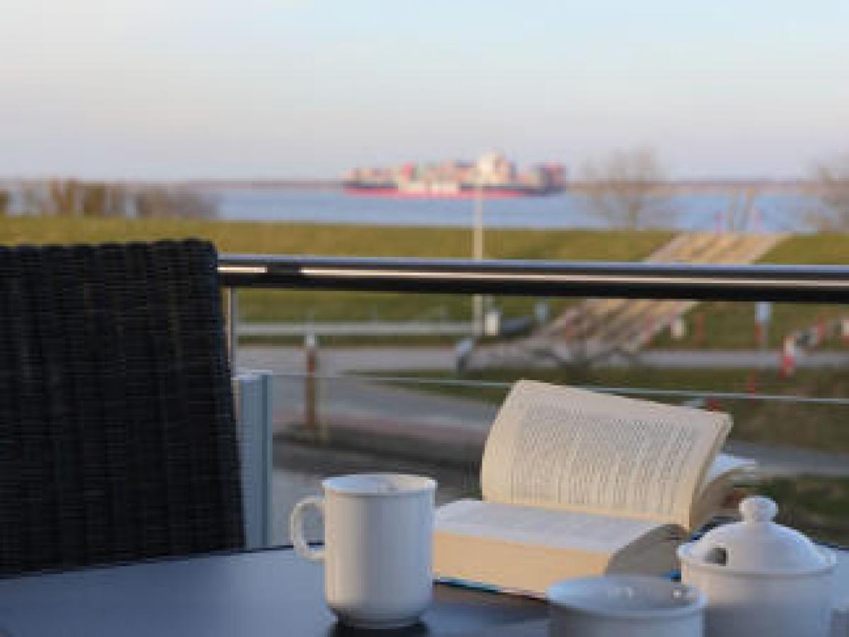 Freier Blick auf Schiffe und Strom. Das neue Elbstrand Resort liegt direkt an der Elbe. Wellness findet dort nicht nur drinnen, sondern auch draußen statt.