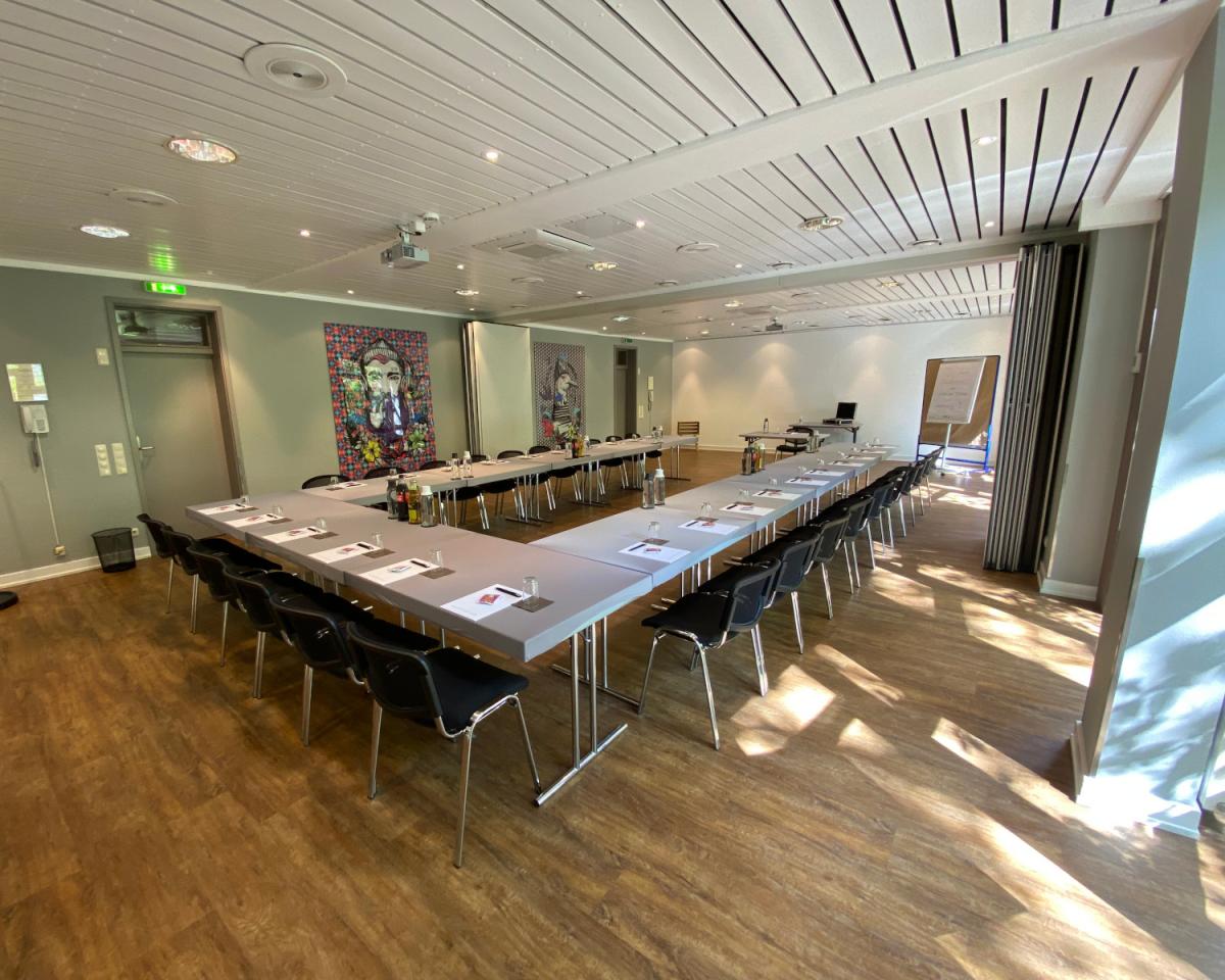 Tagende können dort auf eine ruhige Lage bauen und auf ein entspanntes Hotelambiente, das mit Einrichtungspfiff, munteren Farbakzenten und einer Prise Eleganz für sich einnimmt. Zum Arbeiten hat man die Wahl unter verschiedenen Räumlichkeiten (18–86 m²), die jeweils tageslichthelle und gut ausgestattete Wirkungsflächen für ungestörtes Kommunizieren und Lernen darstellen. Warme Farbtöne, Stuck-Elemente und angenehme Lichtquellen tragen zusätzlich zum Wohlfühlen und produktiven Arbeiten bei. Wer sich nach frischem Wind für neue Gedanken sehnt, kann in 5 Seminarräume von Terrassen mit Blick ins Grüne profitieren.