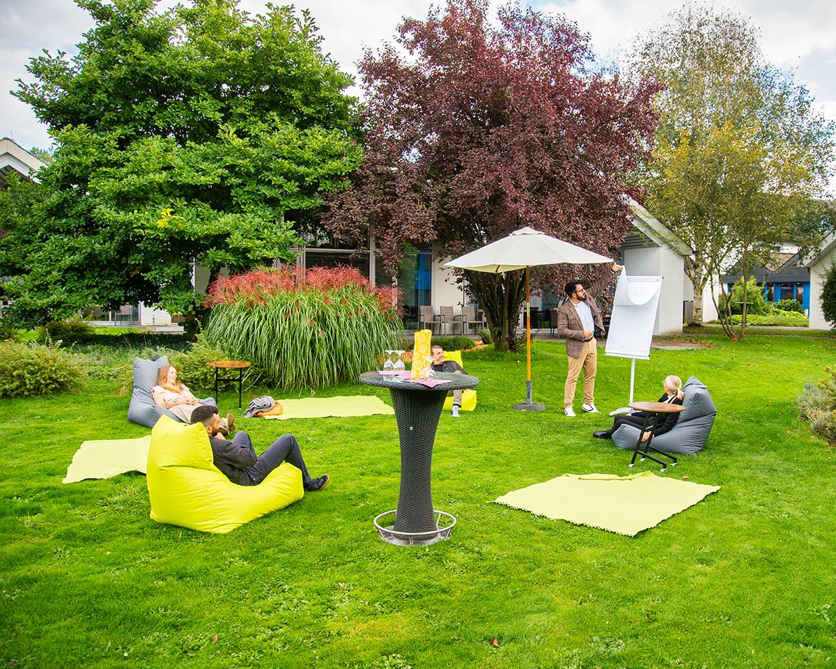 Die großzügige grüne Parkanlage unseres Hotels bietet hervorragende Plätze für Aktivitäten im Tagungsformat. Vor den Tagungsräumen sind tagungskonform ausgestattete Outdoor-Bereiche eingerichtet. So wird naturnahes Arbeiten für die Teams zum Open Air Event. Über die geräumige Pausenlobby gelangen Sie direkt auf unsere weitläufige hoteleigene Parkanlage. Diese weiteren Rückzugsorte für den Aufenthalt im Freien bieten den Arbeitsgruppen oder Gesprächskreisen eine Vielzahl von neuen Möglichkeiten, selbst interaktive Tagungsformate wie z.B. Barcamp oder World Café, umzusetzen.