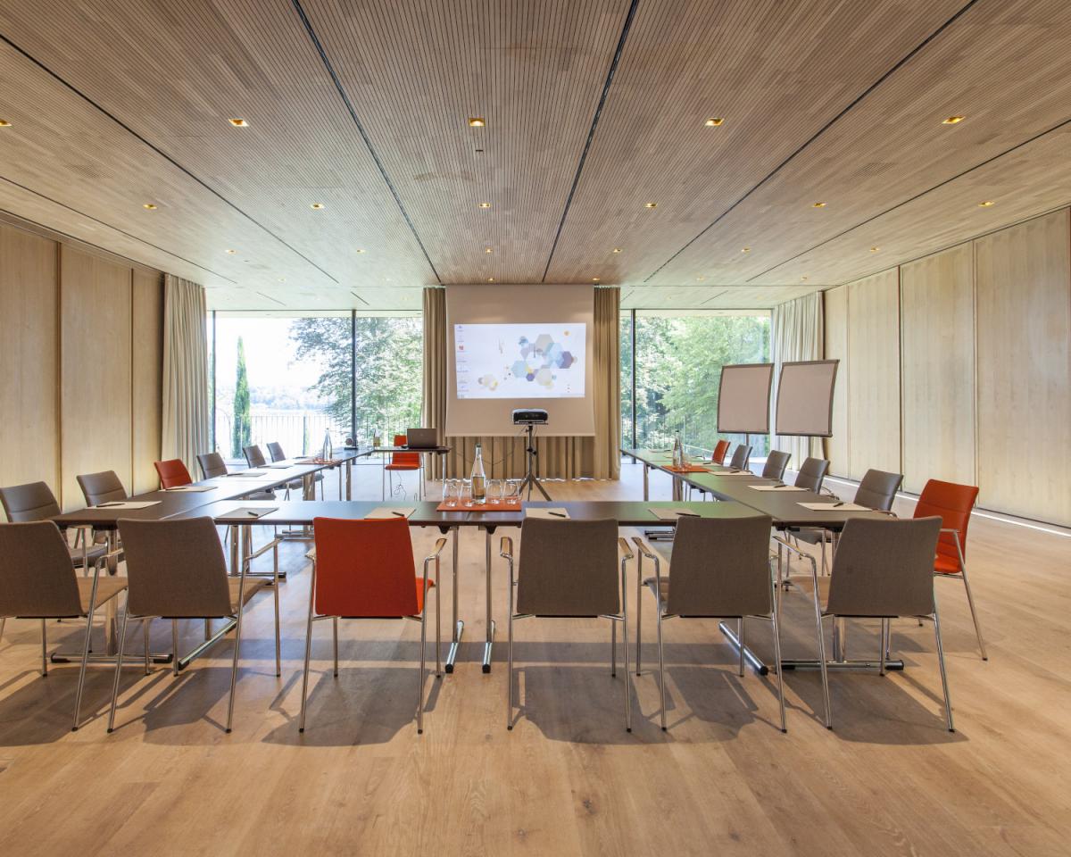 Auf dem sanften grünen Hügel unserer Parkanlage mit zauberhaftem Ausblick. Luftig, gradlinig - hier lenkt nur der herrliche Seeblick ab. Die Stimmung eines Tagungsraum beeinflusst die Qualität einer Tagung ganz wesentlich. Unser Gartenpavillon liefert den Beweis. Auf 135 m² können bis zu 144 Personen tagen, meeten, kreativ sein und neue Produkte kennenlernen.