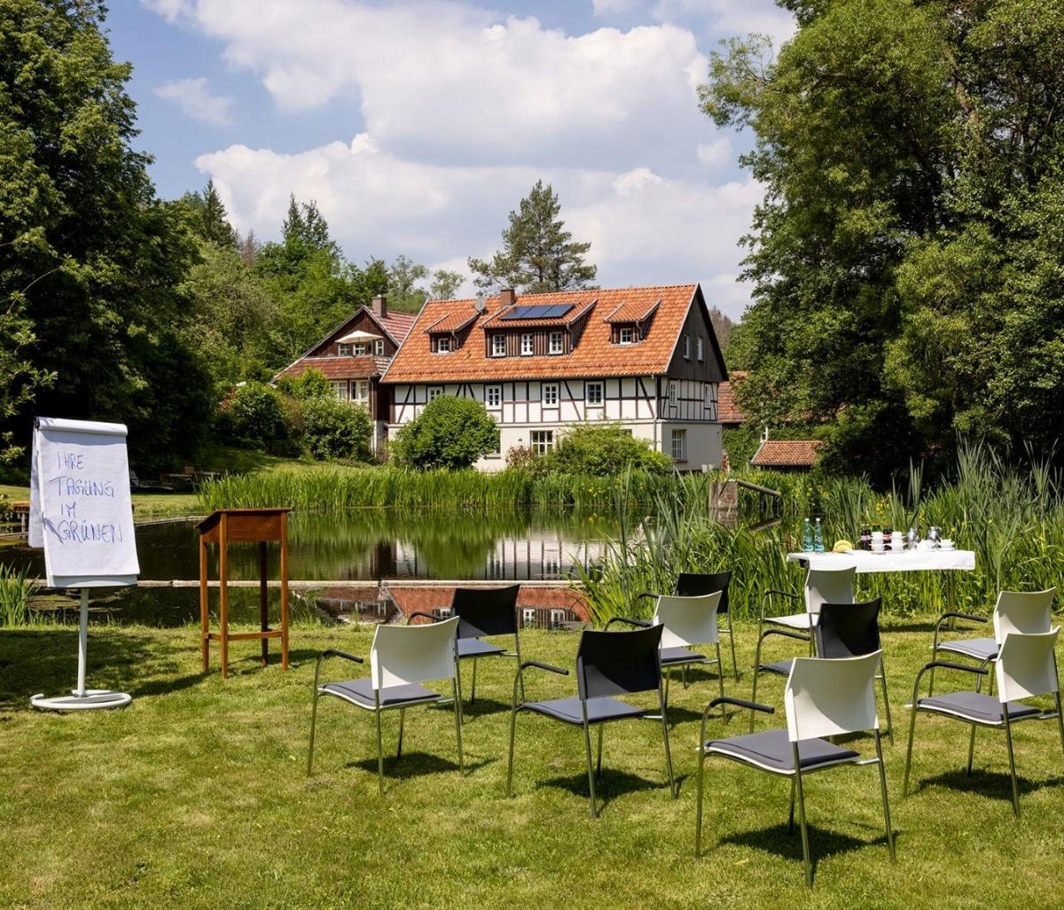 Das Hotel ist von einem herrlichen Landschaftsgarten umgeben, der zu vortrefflichen Teambuildings-Aktionen einlädt. Ein Gesamtkunstwerk der Naturkultur, das für Nachhaltigkeit im besten Sinne steht: Einerseits kann das Anwesen auf eine mehr als 500-jährige Geschichte zurückblicken, andererseits lebt es sich in der Mühle ganz im hier und jetzt - mit köstlichen kulinarischen Genüssen aus vornehmlich biologischem Anbau.