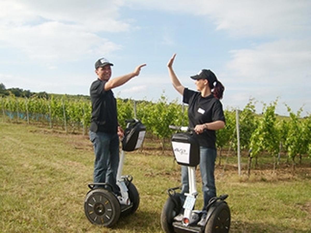 … aber Durst hat noch keiner. Dafür macht das Segwayfahren einfach viel zu viel Spaß! Zwei Räder, eine Achse, aufgeladene Akkus, die Balance des eigenen Körpers und ein Sicherheitshelm für den Kopf – mehr braucht es nicht, um beschwingt und fast geräuschlos durch die Weinberge von Asselheim zu gleiten.