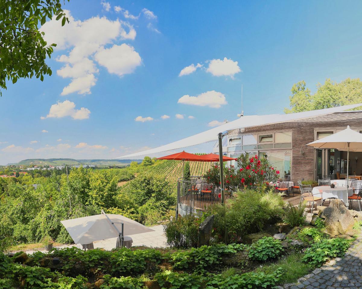 Das lichtdurchflutete Restaurant mit großem Wintergarten und herrlicher Gartenterrasse lädt zum Verweilen ein und ist ideal für kulinarische Feiern und Events. Von hier genießt man die wunderschöne Aussicht auf Weinberge, die Stadt Weinsberg und die Burg Weibertreu.