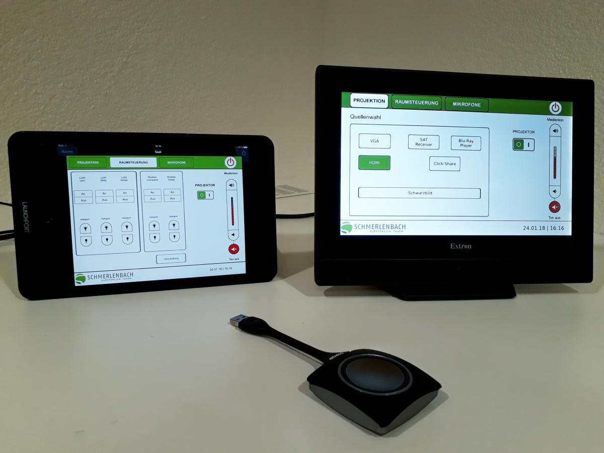 Das Tagungszentrum Schmerlenbach verfügt inzwischen in den zentralen Konferenz- und Tagungsräumen über mobile funkgesteuerte Bedientablets für die gesamte Medien- und Beleuchtungstechnik. Referenten und Trainer können damit jederzeit und von jedem Punkt des Tagungsraums aus über die Touchscreen-Oberfläche des 8“-iPad die Präsentationstechnik und die Lichtszenerie steuern. Das Bedienfeld ist übersichtlich und selbsterklärend; - ideal für den Tagungsbetrieb.