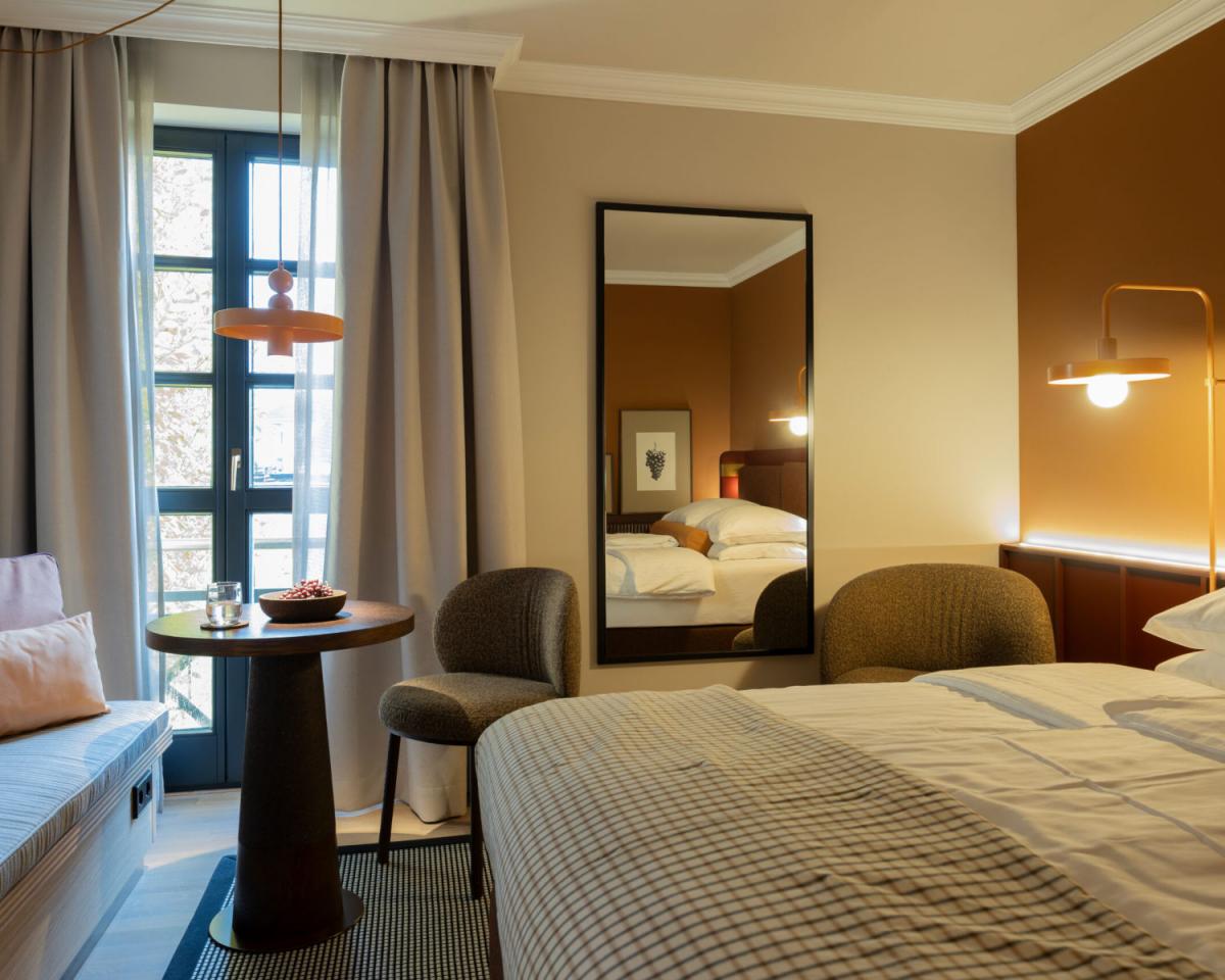 In Zusammenarbeit mit den renommierten Spezialisten für Hotel-Gestaltung aus Hamburg, JOI Design, wurde ein Gesamtkonzept entwickelt, das nach der ersten Modernisierungsphase von Juli bis September 2025 über die nächsten Jahre hinweg kontinuierlich umgesetzt wird. Bis dato wurden insgesamt 17 Zimmer in den Kategorien Einzelzimmer Comfort, Einzelzimmer Business und Doppelzimmer Comfort renoviert. Das gewählte Motto „Tradition und Wein“ spiegelt sich in den neu gestalteten Räumen fein nuanciert sowohl in der Farbgebung als auch hinsichtlich der Auswahl von Materialien sowie der stilsicheren Bebilderung.