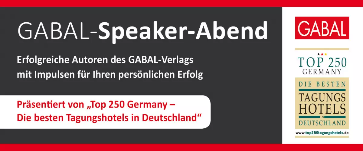 Während zweier Veranstaltungen, beim GABAL-Speaker-Abend am Montag, 24.6., im Pfalzhotel Asselheim sowie am Donnerstag, 27.6., auf Gut Hühnerhof, präsentiert Ihnen "TOP 250 Germany - Die besten Tagungshotels in Deutschland" erlebenswerte Impulse für Ihren beruflichen wie auch privaten Erfolg. Lernen Sie in kurzweiligen, inhaltsreichen Vorträgen zwei Top-Autoren des GABAL-Verlags kennen, vertiefen Sie Ihre Kontakte mit einigen Top-Tagungshotels und mit vielen anderen Gästen aus der regionalen Businesswelt!