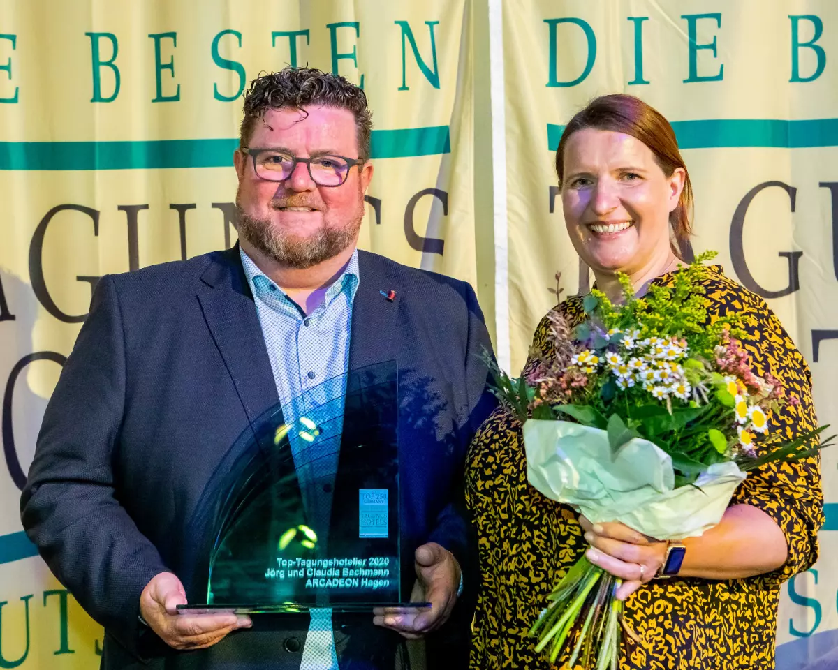 Der Titel „TOP-Tagungshotelier des Jahres“ geht in diesem Jahr an Jörg und Claudia Bachmann vom Arcadeon in Hagen. Der Branchenpreis würdigt Persönlichkeiten, die sich durch innovatives Handeln, durch unternehmerischen Mut und kreatives Vordenken um die Entwicklung der deutschen Tagungshotellerie verdient gemacht haben. 2020 geht die Auszeichnung nach 11 Jahren zum ersten Mal an ein Hotelier-Paar. Vorjahres-Preisträger Martin Kirsch, Geschäftsführer des Hotels Schloss Hohenkammer, überreichte die Ehrung anlässlich der Auszeichnungsveranstaltung „TOP 250 - Die besten Tagungshotels in Deutschland“, die coronakonform am Sonntag, 13. September 2020, in Schloss Hohenkammer bei Münschen stattfand.