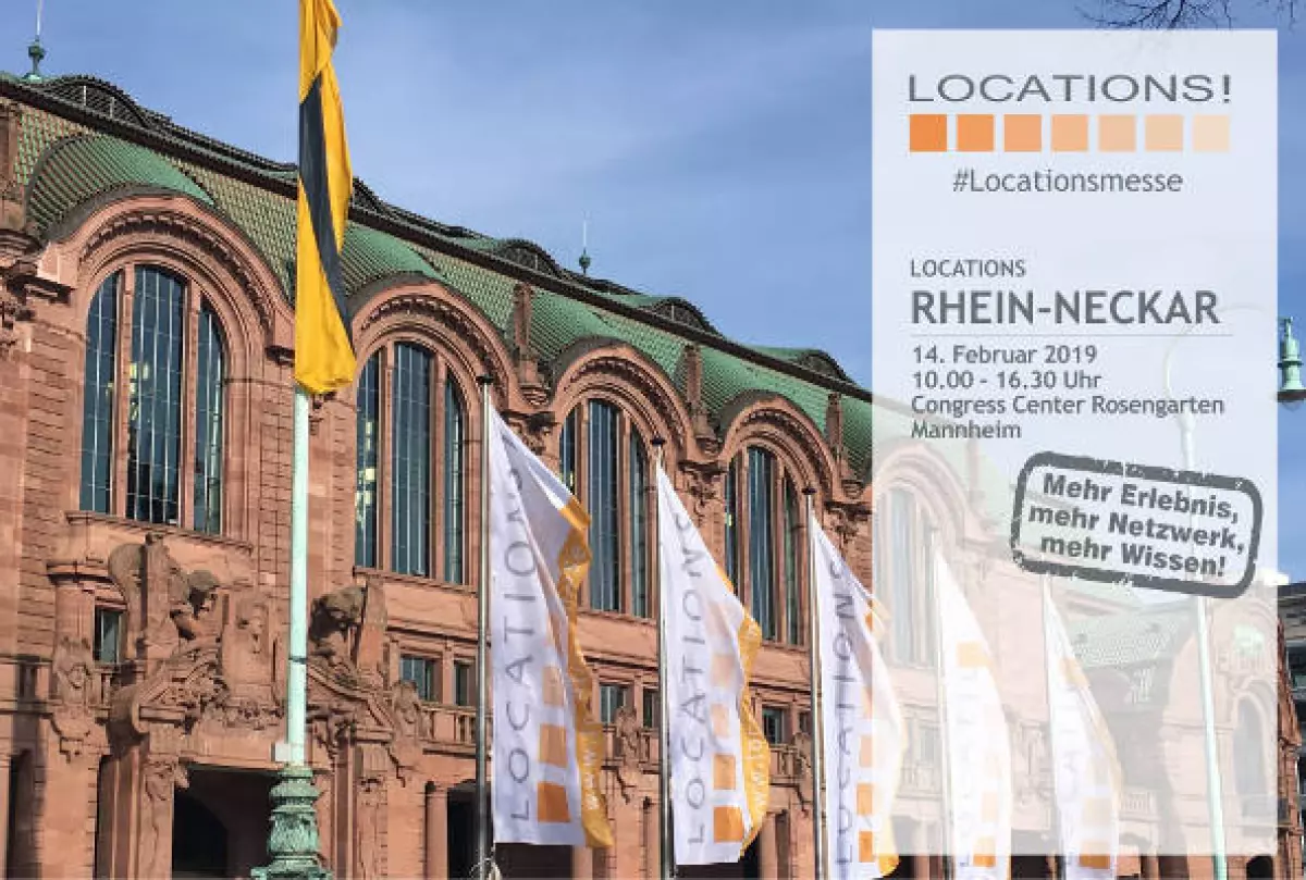 Starten Sie gut ins Jahr 2019 und holen Sie sich am 14. Februar bei der LOCATIONS!-Messe in Mannheim zahlreiche neue Impulse und Ideen für Ihre nächste Veranstaltung. Informieren Sie sich über die wichtigen und einzigartigen Locations in der Metropolregion Rhein-Neckar. Nutzen Sie das neue attraktive Rahmenprogramm mit vielen Praxistipps. Und tauschen Sie sich mit Kollegen und Dienstleistern aus der Eventbranche aus.