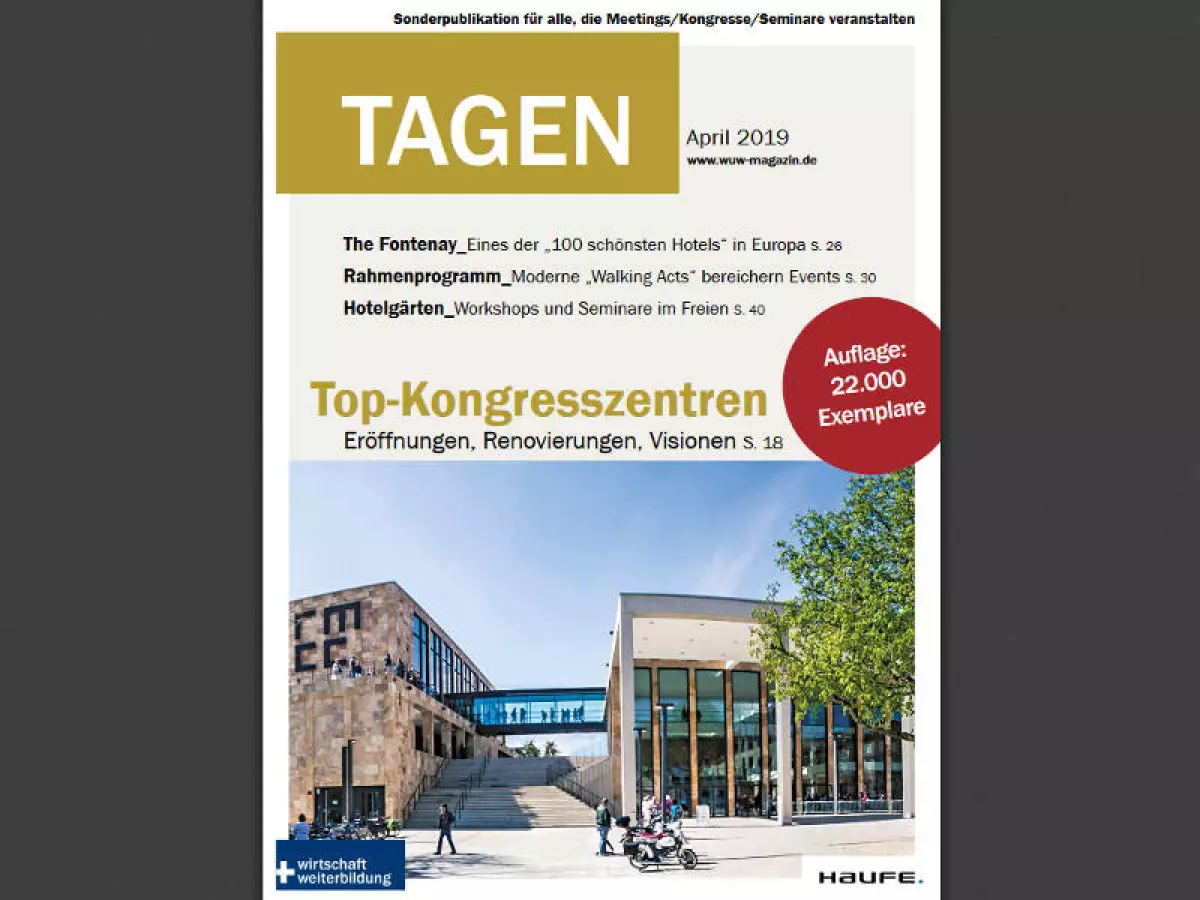 Deutschland ist eines der wichtigsten Reiseziele europäischer Manager. Und Kongresse sind der häufigste Grund, weshalb Geschäftsreisende nach Deutschland kommen. Deshalb widmet sich die neue Sonderpublikation "Tagen" des HAUFE Verlags dem Thema "Top-Kongresszentren - Eröffnungen, Renovierungen, Visionen". Im Heft finden Sie darüber hinaus weitere aktuelle Themen, Nachrichten aus der Branche sowie eine große Auswahl ansprechender Locations für Meetings, Seminare und Kongresse.